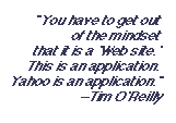 A lot of these Web sites are actually different ways of computerizing things that were difficult to computerize in the past. A really good example is maps.yahoo.com. Type in two addresses and you get back a map and a set of directions. That's pretty cool. That is a classic information application, not something you would have been able to do even a few years ago. There are probably hundreds, even thousands, of different kinds of information applications that the Web is enabling that are going to transform the computer industry.
